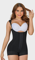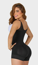 Faja extracorta de alta compresión con espalda cubierta. Incluye hombreras removibles que ofrecen soporte en esta zona, 2 niveles de abrochadura, cierre en la parte inferior que facilita el uso del baño, realce natural en glúteos con un diseño exclusivo y discreto, y siliconado en piernas que evita que se enrolle o recoja.