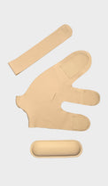 Su diseño incluye abertura en orejas que puede ampliarse con tijeras según necesidad, bandas con adhesivo ajustable para graduar compresión, almohadilla y banda opcional para reforzar el control en la papada. Una solución práctica y estética para una recuperación segura y con estilo.